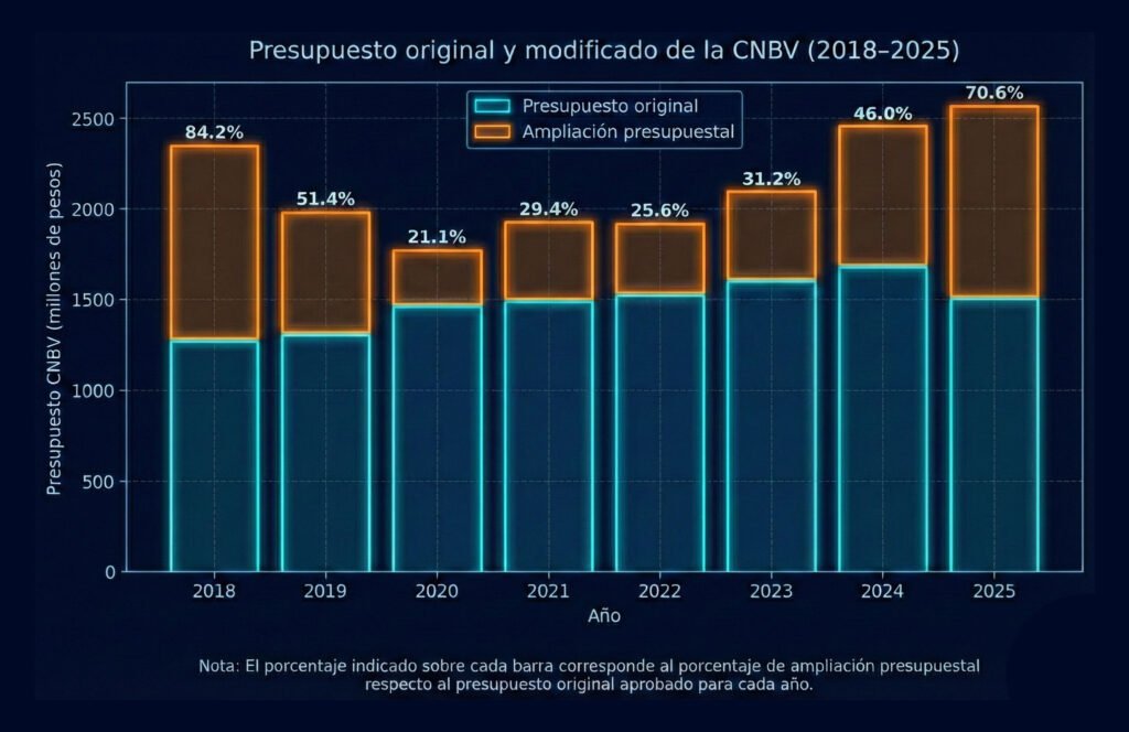 Si bien las ampliaciones presupuestales para la CNBV son recurrentes, los datos muestran que el incremento de 70% es considerablemente mayor a lo observado en ejercicios anteriores, por lo que, a reserva de conocer las cifras definitivas a diciembre, puede afirmarse que durante el 2025 el organismo supervisor del sistema financiero mexicano ejerció un presupuesto histórico.